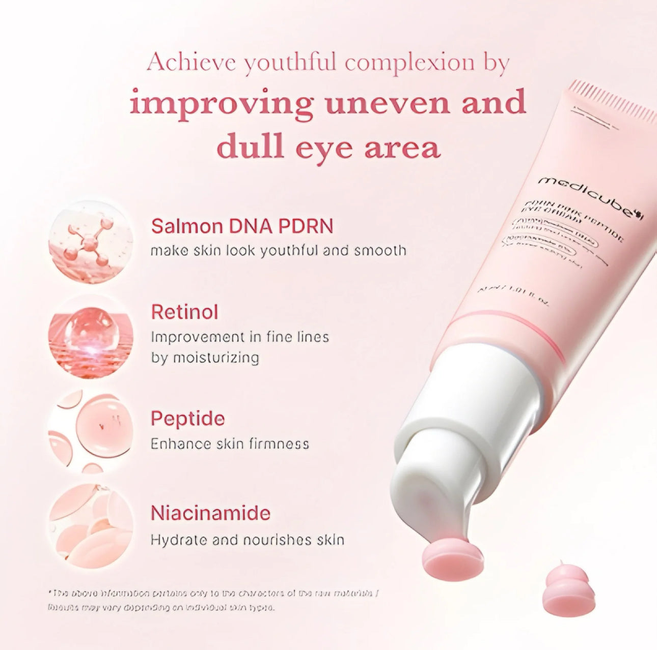 - This eye cream is formulated with Niacinamide, Peptide, Retinol, and Salmon PDRN that help reduce the appearance of darkened areas and improve dull eye areas with intensive hydration.